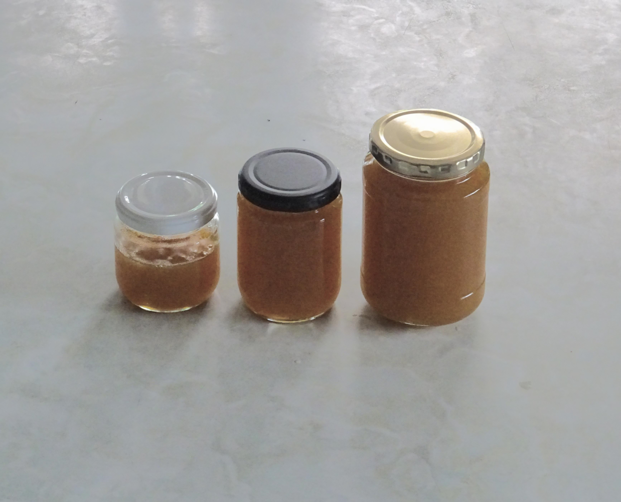 煮詰めていると結構プツプツと飛び跳ねるのでやけどに注意です。出来上がりは、500㎖の大瓶1本、250㎖の中瓶1本、それに180㎖の小瓶半分強でした。ヨーグルトにかけて食べるのにちょうど良い甘さです。